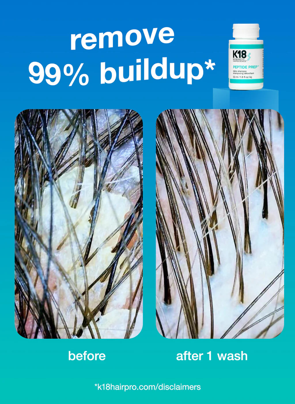 One use of PEPTIDE PREP™ detox shampoo removes: 99% of product buildup*, 95% of sebum*, and 76% of copper*